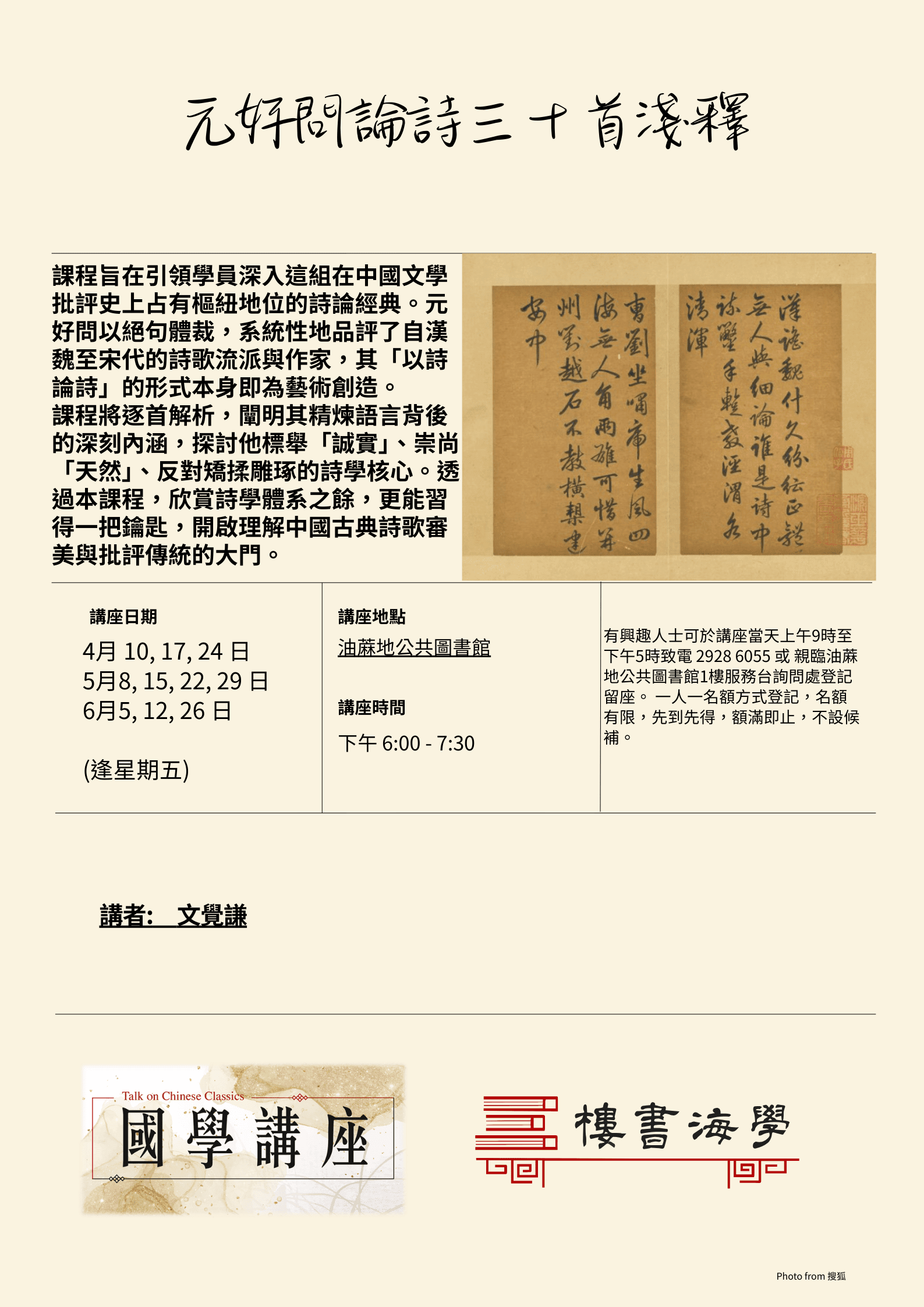 課程將逐首解析,闡明其精煉語言背後的深刻內涵,探討他標舉「誠實」、崇尚「天然」、反對矯揉雕琢的詩學核心。透過本課程,欣賞詩學體系之餘,更能習得一把鑰匙,開啟理解中國古典詩歌審美與批評傳統的大門。