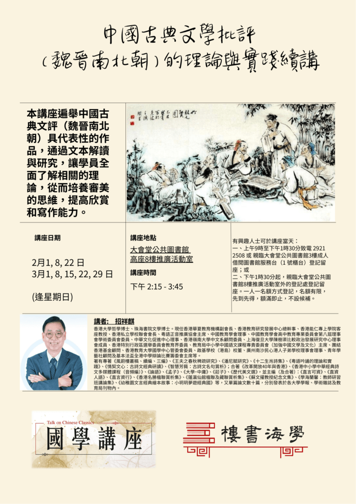 本講座遍舉中國古典文評(魏晉南北朝)具代表性的作品,通過文本解讀與研究,讓學員全面了解相關的理論,從而培養審美的思維,提高欣賞和寫作能力。
