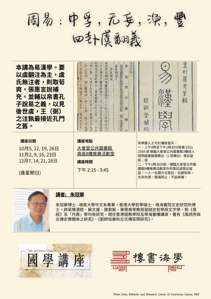本講為易漢學。要以虞翻注為主,虞氏無注者,則取荀爽,張惠言說補充。並輔以帛書孔子說易之義,以見後世虞,王(弼)之注孰最接近孔門之舊。