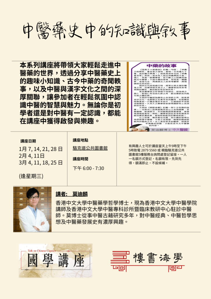 本系列講座將帶領大家輕鬆走進中醫藥的世界,透過分享中醫藥史上的趣味小知識、古今中藥的奇聞軼事,以及中醫與漢字文化之間的深厚關聯,讓參加者在輕鬆氛圍中認識中醫的智慧與魅力。無論你是初學者還是對中醫有一定認識,都能在講座中獲得啟發與樂趣。